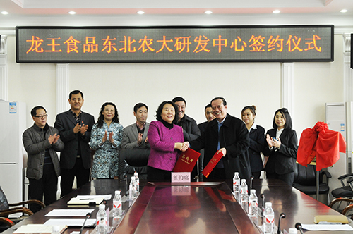 签约仪式上,郑秋鹛、李忠珠分别代表伟德国际1946和黑龙江农垦龙王食品有限责任公司和在校企共建研发中心协议书上签字。在与会人员的见证下,郑秋鹛、张显伟、李忠珠、邵志远共同为“龙王食品东北农大研发中心”揭牌。