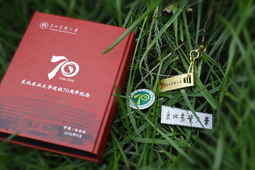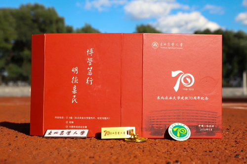 校庆70周年纪念章,以学校70周年标识为主要图案,同时将学校名称标准字与“1948-2018”组和,寓意东农人以建校70周年为新的起点,众志成城,共谋发展,在“世界一流学科”和高水平大学建设的征程中不懈奋进。