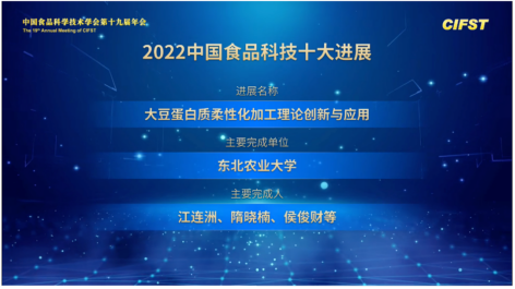12月14日,在合肥召开的中国食品科学技术学会第19届年会上,中国工程院院士、中国食品科学技术学会理事长、北京工商大学校长孙宝国教授代表学会发布了“2022中国食品科技十大进展”。我院江连洲教授、隋晓楠教授、侯俊财教授和徐泽健副教授共同申报的科研成果“大豆蛋白质柔性化加工理论创新与应用”,经形式审查、同行评议和权威专家评审等程序,在众多候选项目中脱颖而出,成功入选。