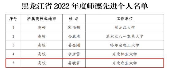 为弘扬我省教育系统广大教师立德树人精神,为全省教师选树学习榜样,进一步营造尊师重教的良好社会风尚,省教育厅近日印发《关于表彰2022年度全省师德先进集体和师德先进个人的决定》,全省共评选出师德先进集体60个,师德先进个人154人。我院姜毓君教授获得“2022年度全省师德先进个人”荣誉称号。