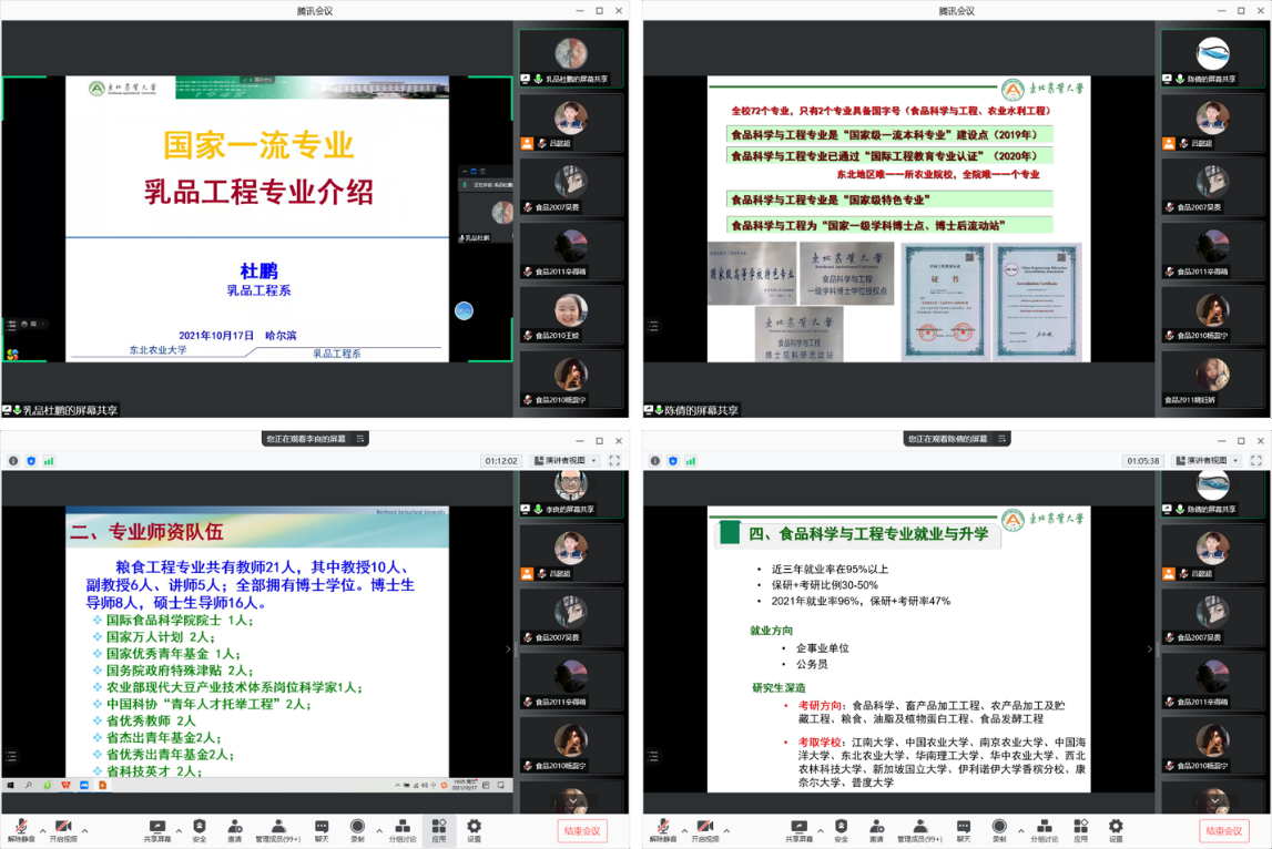 会上,乳品工程系副主任杜鹏对乳品工程专业历史和师资进行了详细的介绍。针对乳品工程特有的“3+1”人才培养模式和培养目标进行了充分的解读。食品质量与安全系副主任徐宁阐述了食品质量与安全的人才培养目标,同时强调食品质量与安全系将社会需求融入培养目标之中,培养实用新型人才。食品科学与工程系副主任陈倩对食品科学与工程专业的教师团队和科研教学奖项进行了详细的介绍,同时对就业和升学情况进行了充分的分析。粮食工程系主任李良也围绕粮食工程专业发展定位、知识结构和能力素养进行充分讲解。
