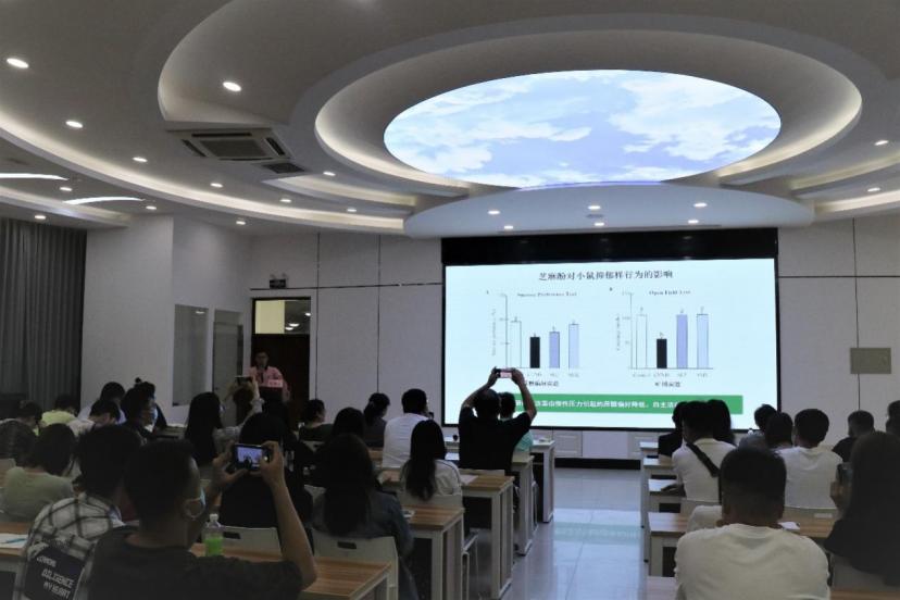 刘学波教授首先讲解“健康中国”理念,把健康摆在优先发展的战略地位,推进健康中国建设,提高人民健康水平,深入开展食物营养功能评价研究,并对重点区域、重点人群实施营养干预,重点解决人群高热能食物摄入过多等健康问题。报告主要从“吃什么”膳食因子、“怎么吃”膳食模式两个途径来探究营养干预对神经认知功能障碍和糖脂代谢紊乱的作用机制,讲解了“肠-脑”微生态免疫、“肝-脑”糖代谢平衡、“肠-肝-脑”生物钟应答等三个体系的协调作用机制。此次报告内容丰富精彩,在聆听报告后,现场师生在提问环节就报告中的内容与刘学波教授交流互动,对今后的科研和学习有很大启发。