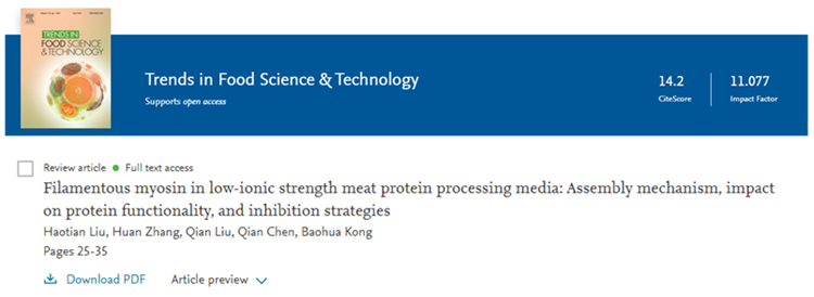 3月28日,我校“肉品加工与质量安全控制”团队在食品国际顶尖权威学术刊物《Trends in Food Science & Technology》(一区,IF=11.077)在线发表了题为“Filamentous myosin in low-ionic strength meat protein processingmedia: assembly mechanism, impact on protein functionality, and inhibitionstrategies”的高水平论文。
