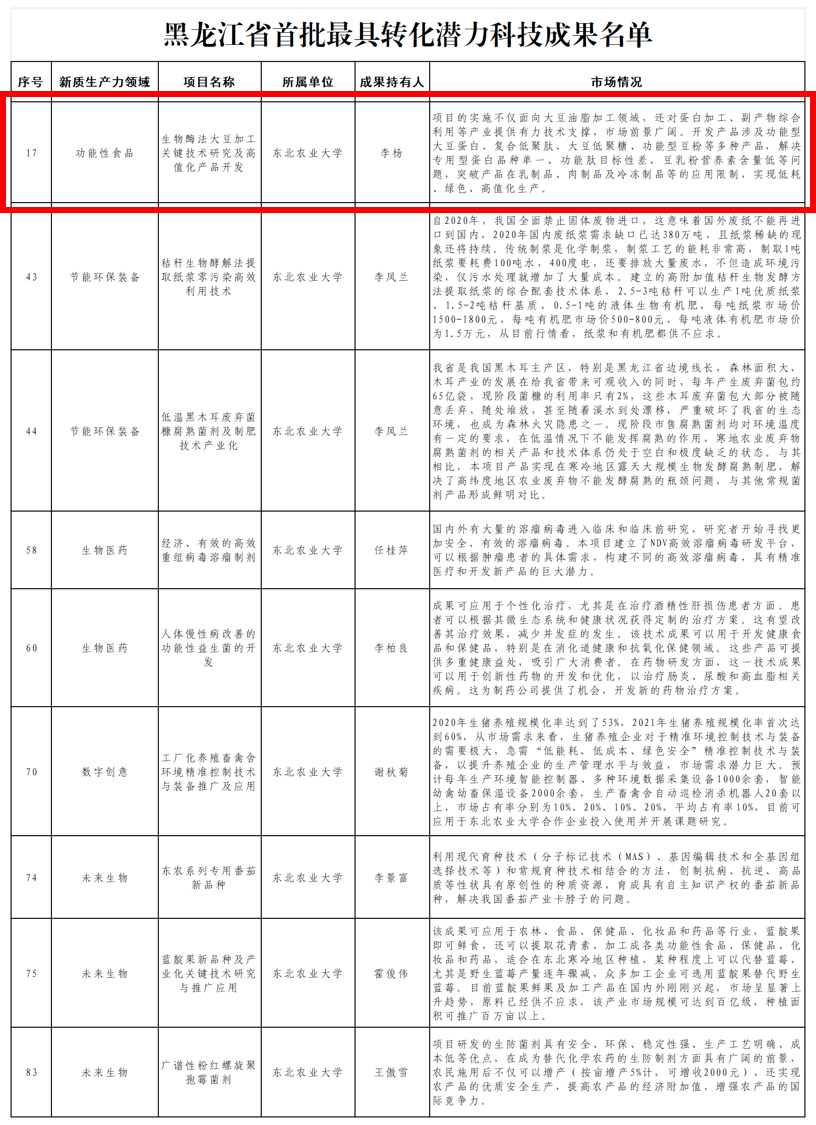 我院李杨教授的“生物酶法大豆加工关键技术研究及高值化产品开发”科技成果成功入选。