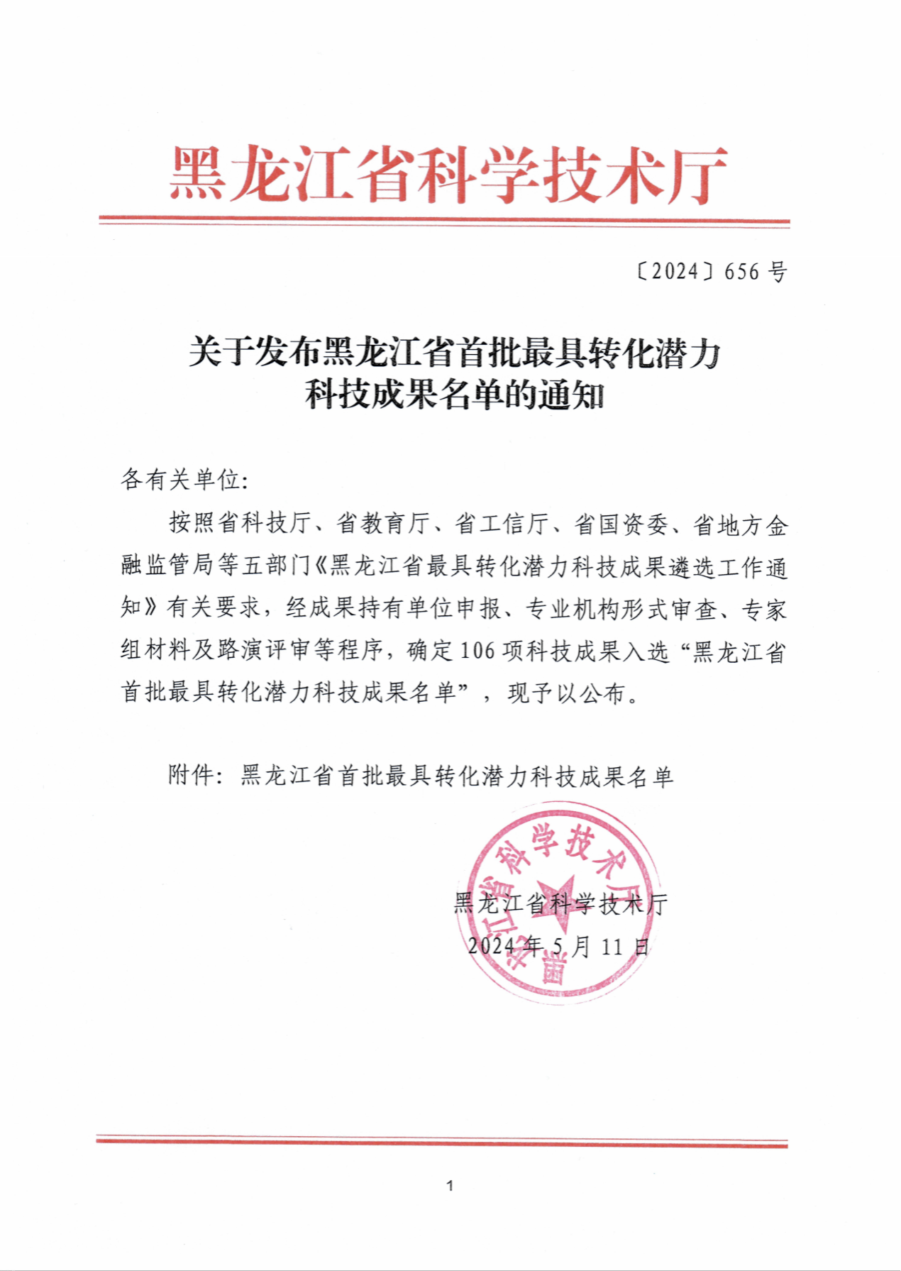 经过前期专业机构形式审查、首轮初评筛选、线上BP盲审及路演评审等多轮评选,近日,黑龙江省科学技术厅公布了“黑龙江省首批最具转化潜力科技成果名单”,共评选出最具转化潜力科技成果106项。我校9个项目入选成果数量排名全省高校第四位,位居省属高校首位。