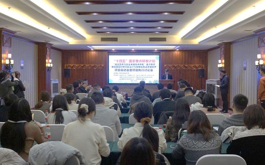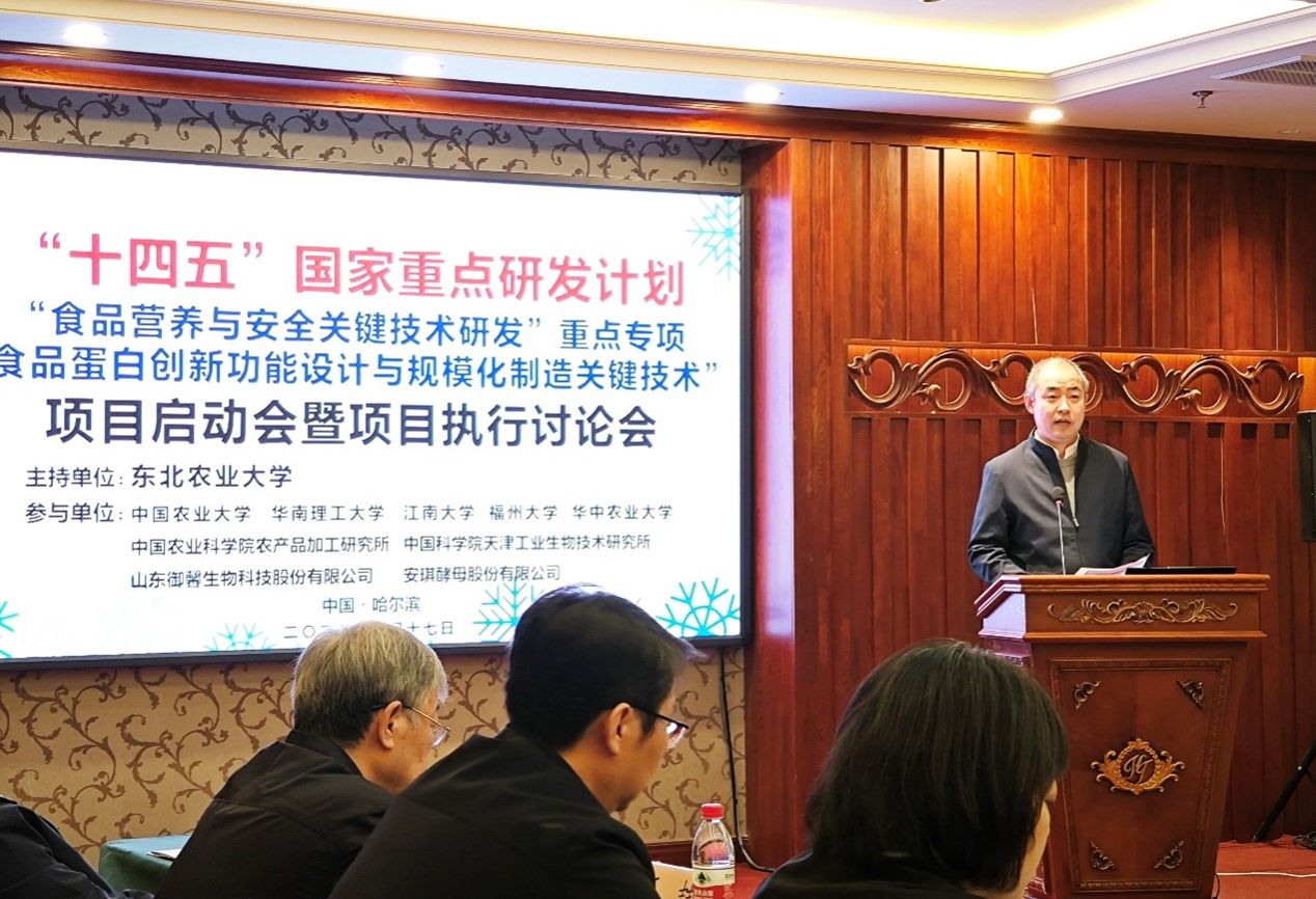 1月17日上午,由我院隋晓楠教授牵头的国家重点研发计划“食品营养与安全关键技术研发”重点专项“食品蛋白创新功能设计与规模化制造关键技术”项目启动会暨项目执行讨论会在哈尔滨召开。中国食品科学技术学会研究员王喆、北京市农业农村局一级巡视员马荣才、中国农科院质标所金芬研究员、沈阳农业大学校长李斌、伟德国际1946教授江连洲,黑龙江省科技厅科技二处副处长王宁,我校副校长孙世钧,科学技术处(社会科学处)处长寇胜利、副处长王子龙及项目、课题负责人、骨干成员等30余人参加会议。会议由寇胜利、王喆分阶段主持。