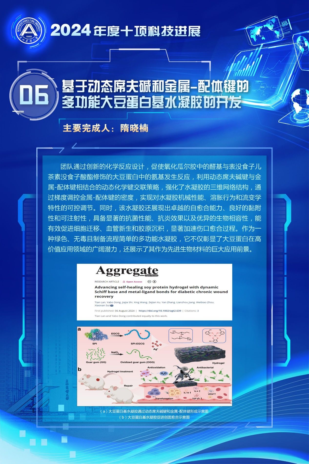 2024年,我校科技工作紧紧围绕服务国家战略需求和区域现代农业发展,聚焦有组织科研、聚力科研平台建设、聚智重大成果产出、聚效新文科建设、聚势管理机制改革,稳步推进科研自主创新能力提升、重大科研任务承担能力提升、高水平科研平台支撑能力提升、科研管理改革创新,各项工作取得了丰硕成果。经学院推荐、形式审查和专家评审等环节,我院隋晓楠教授科研成果“基于动态席夫碱和金属-配体键的多功能大豆蛋白基水凝胶的开发”入选2024年度学校十项科技进展。