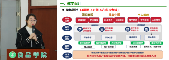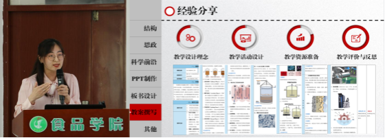 刘璐从“教学设计”“PPT制作”“板书设计”“课堂表现”“教学反思”五个方面分享了个人感悟和赛后经验,表示“工欲善其事,必先利其器”,课程建设十分重要,要注重教学创新和思政融入,并结合所讲课程分享在课程设计和思政元素挖掘上的心得体会。