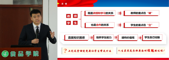 侯坤以“先‘破’后‘立’一种突围性教学的可能”为主题,从竞赛认知、经验分享、教学审思三方面分享竞赛经验,建议青年教师要从灌输教学转向互动教学、从教材体系转向教学体系、从深入浅出到浅入深出、从盲目开课转向学情分析、从仓促结课转向反馈结果。