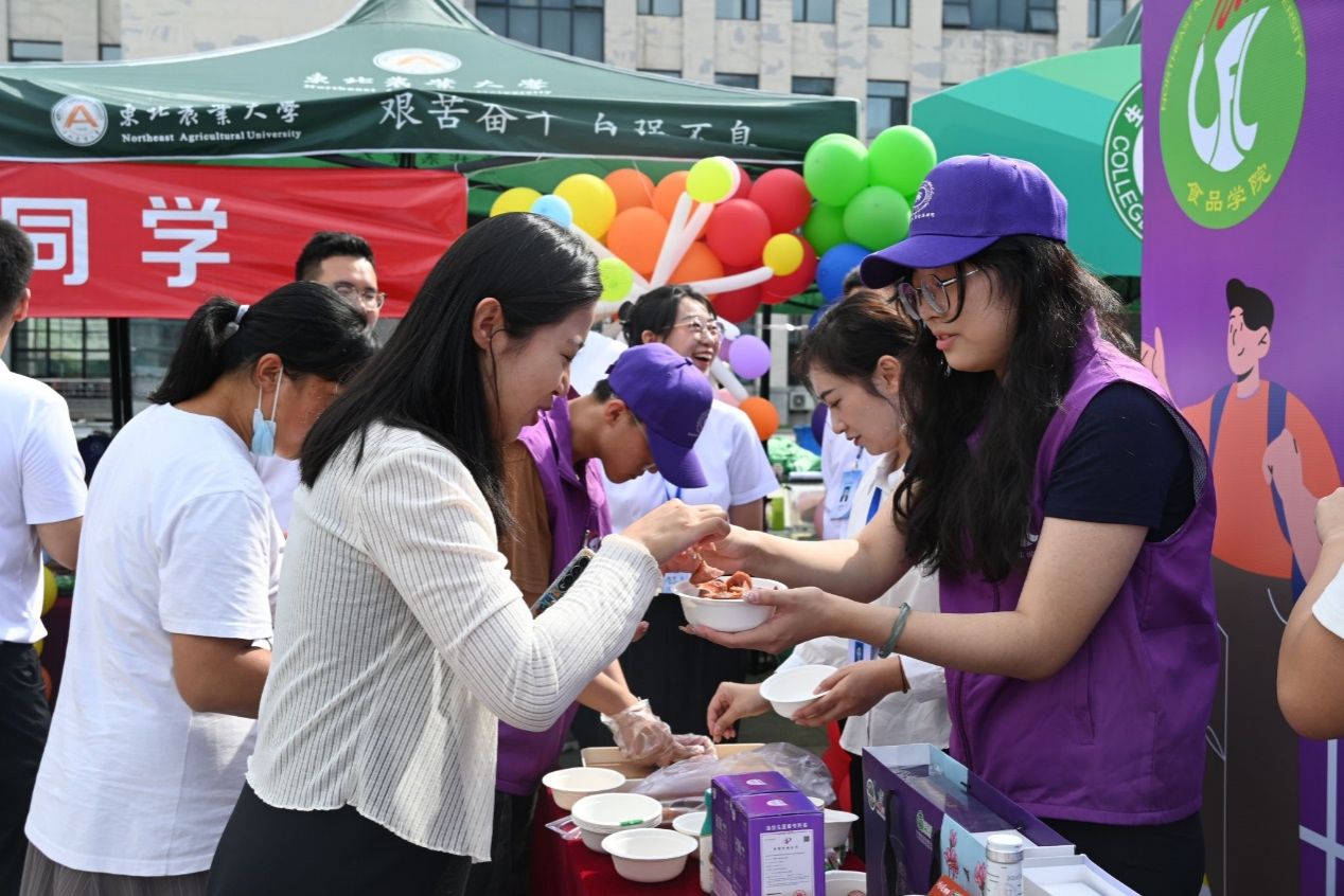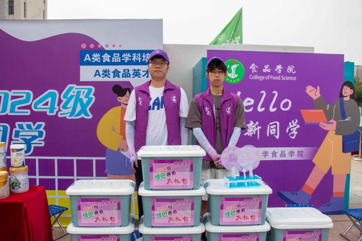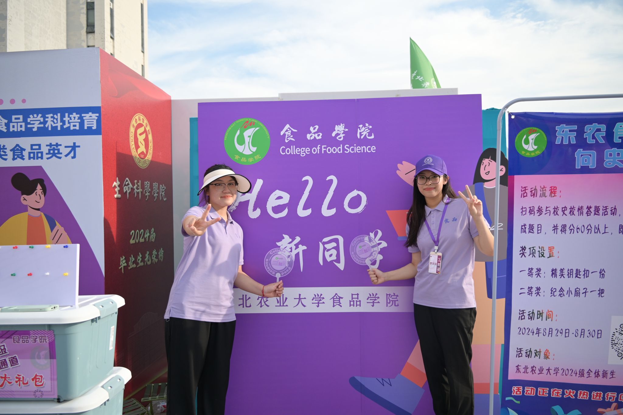 此次迎新季,我院将“食品紫”作为迎新主色调,强化“食品元素”,营造浓厚“食品氛围”。通过搭建文化展板和打卡墙,进一步展示学院历史、特色和文化,还为新生提供了入学的“仪式感”。学院为2024级新生精心准备了一份“萌新礼包”,包括NEAU定制帆布包、军训迷彩服、东农专属POLO衫、食品专属防晒冰袖,为绿色通道学生准备新生加油包,助力新生无忧入学,梦想启航。为激发学生专业认同,增加学科兴趣,学院设立食品科技创新展示台,充分展示学院科研成果,发挥食品专业特点,学院提供农大红肠和酸奶供新生和家长品尝,展示“食品家”特色。