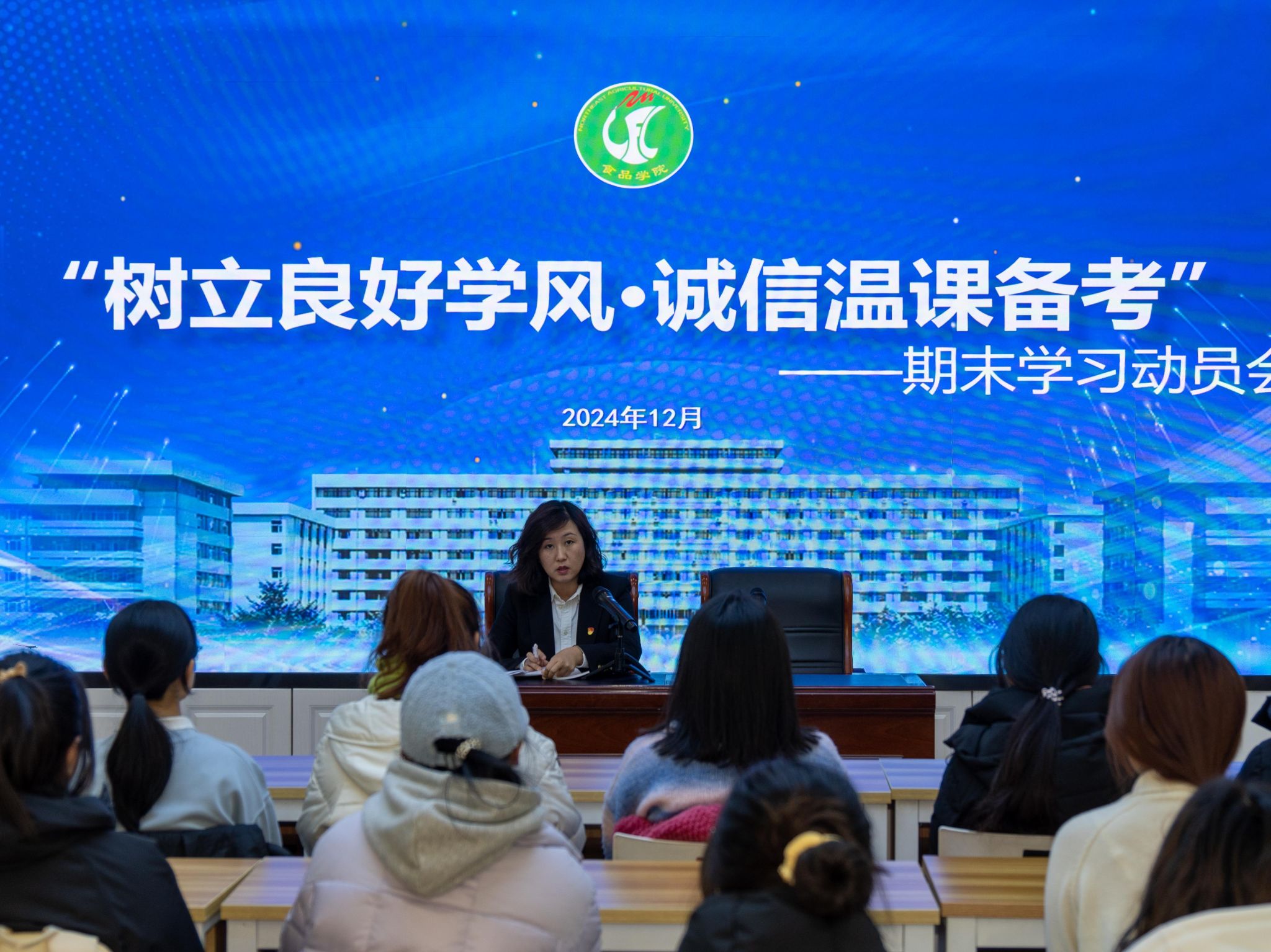 钱芳作2024年秋季学期期末学习动员。她指出,树立严谨勤奋、乐观向上的优良学风,营造诚信、健康的考试氛围对个人成长成才具有重要意义。她结合近年来考试违规违法相关案例,向参会学生解读学校对于考风考纪的相关条例,要求考生要心存敬畏、坚守底线,严格遵守考试纪律。她强调,学生干部要起到模范带头作用,带动身边同学树立良好学风,诚信温课备考。